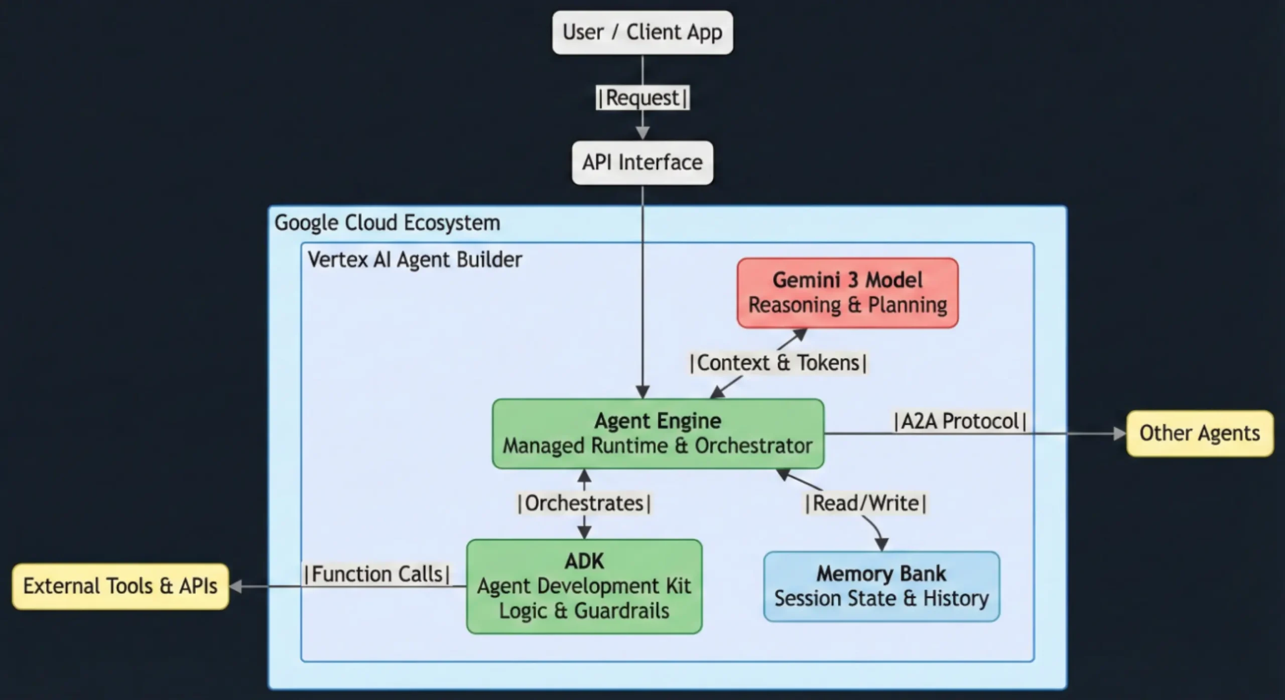 The architecture utilizes the Agent Development Kit (ADK) for defining agent logic, which is deployed to the Vertex AI Agent Engine. It uses Gemini 3 for high-level reasoning and planning. State is managed via Sessions and Memory Stores (Memory Bank). Agents communicate externally or with other agents using the Agent2Agent (A2A) Protocol.